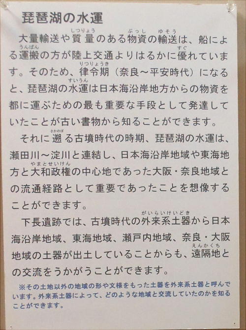 出土から、下長遺跡の古墳時代前期の集落は、琵琶湖の水運を利用した物資の流通を担っていたと考えられるようになった。更に、