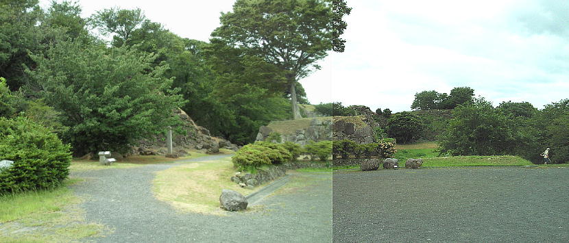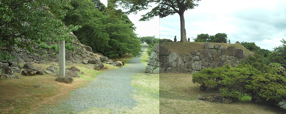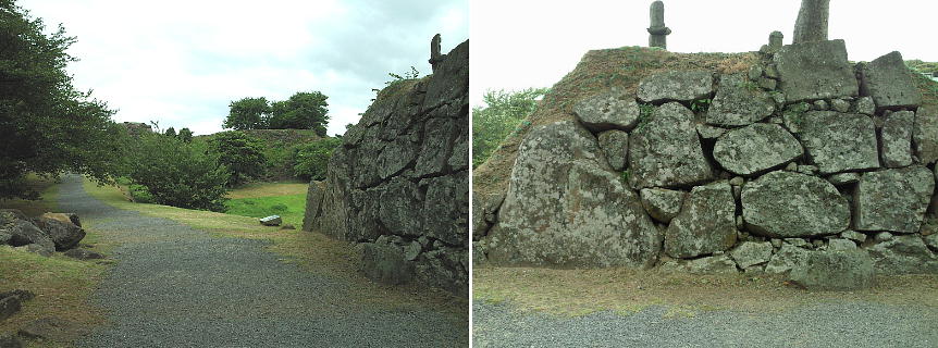 名護屋城大手門跡。大手口と櫓の石垣。左の櫓は崩れてしまっている。