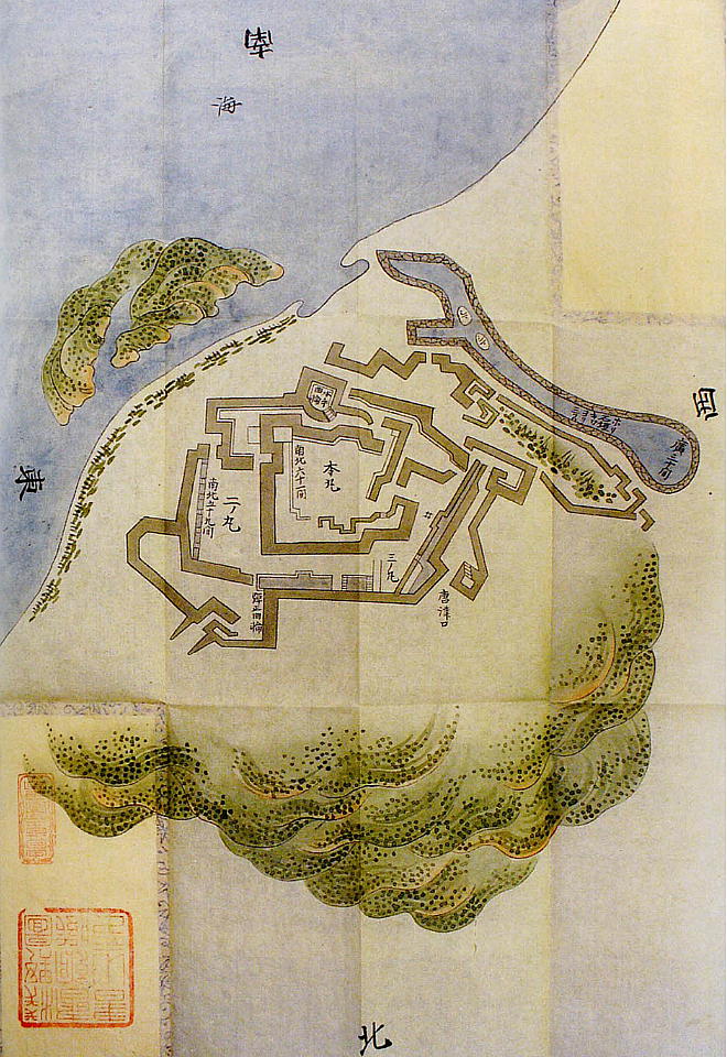 本丸は東西五十六間、南北六十一間、総高さ三十二間一尺五寸であった。乾の角に天守台があり、高さ十五間。海より池まで十二間一