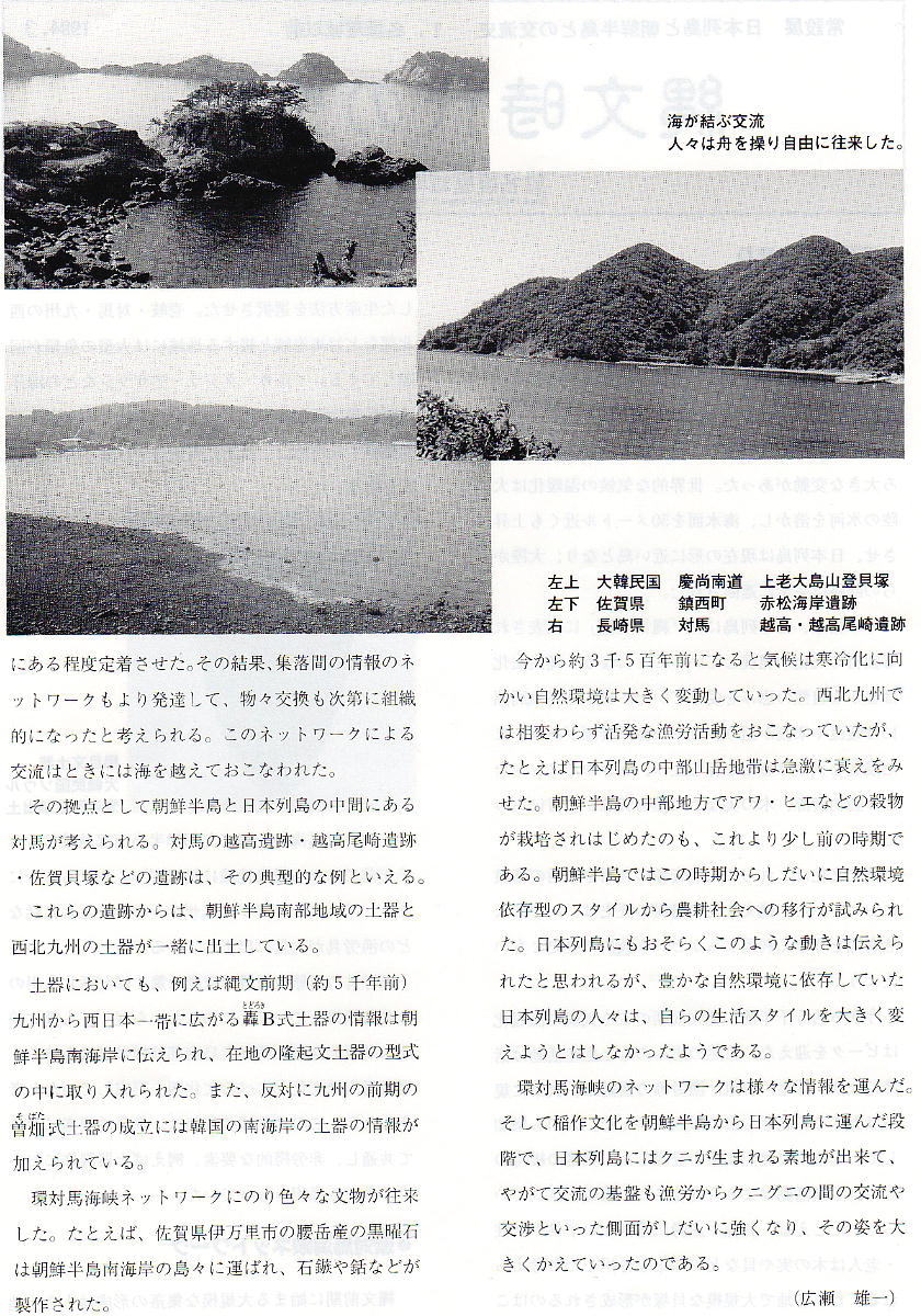 頃から人々の生活の後が確認されており、縄文時代にかけても多数の遺跡が発見されている。ちなみに、朝鮮と対馬の間は氷河でつな