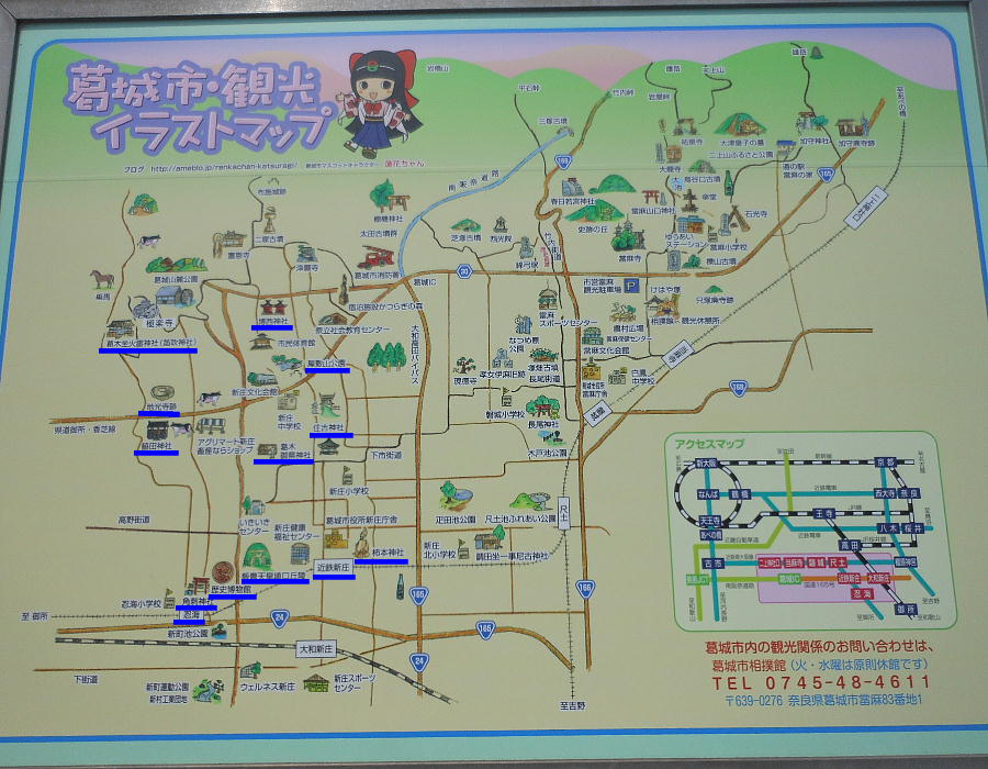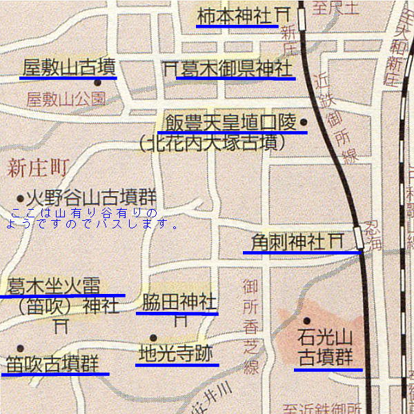 (屋敷山公園)− 飯豊天皇植口陵 − 葛木御県神社 − 柿本神社 − 近鉄「新庄駅」