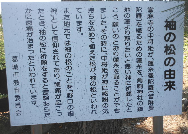 角刺神社の東 500メートルのところに袖の松旧跡がある。當麻寺の中将姫が曼荼羅をおるための蓮糸を角刺神社の鏡池の蓮