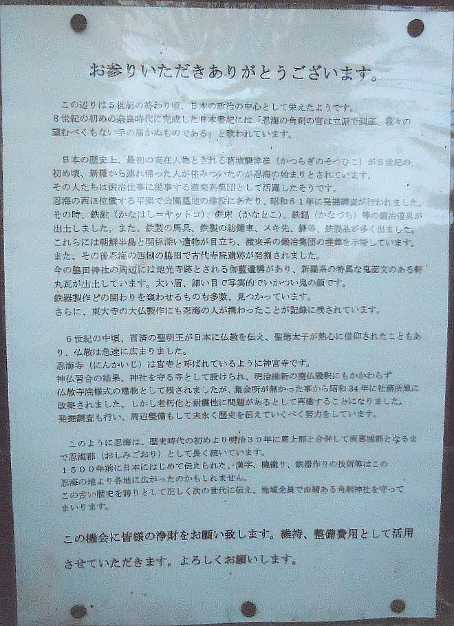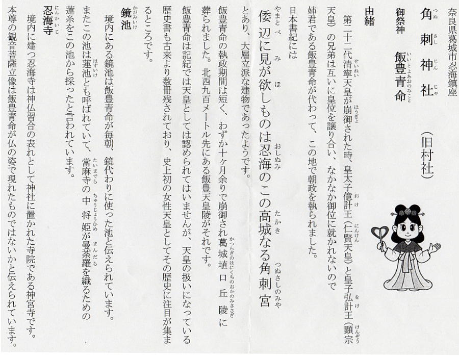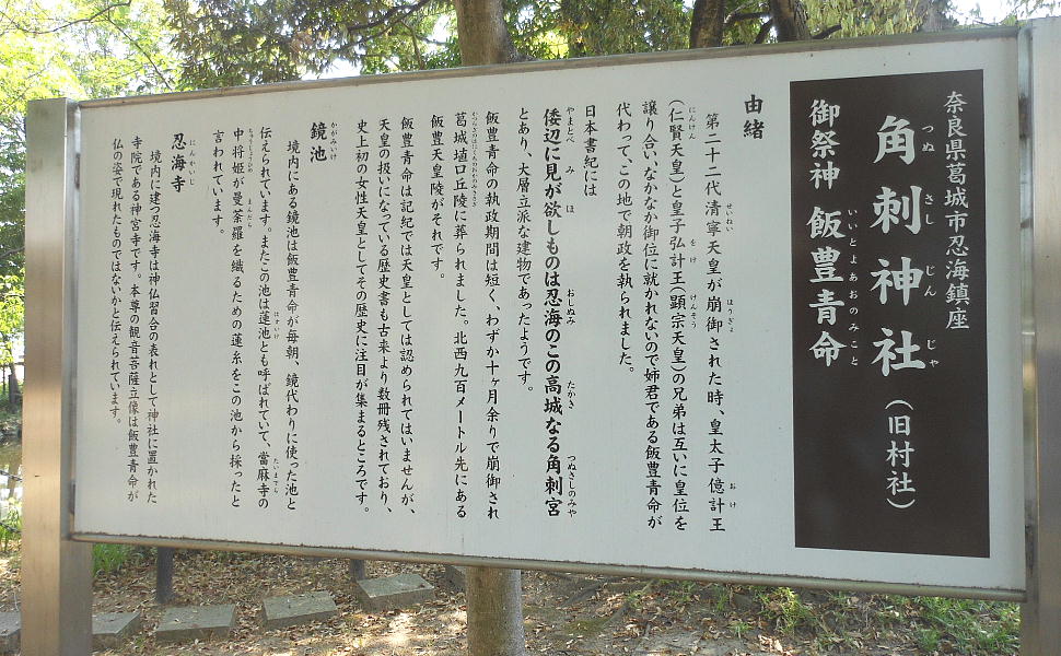 かり、ここ忍海の「角刺宮」で執政を取ったとされている。忍海の「角刺神社」の辺りは「日本書紀」顕宗即位前記で、