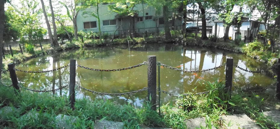 角刺神社境内の東側に、小さな「鏡池」がある。飯豊青皇女が「忍海角刺宮」で政務を取っていた時、毎朝この池で顔を