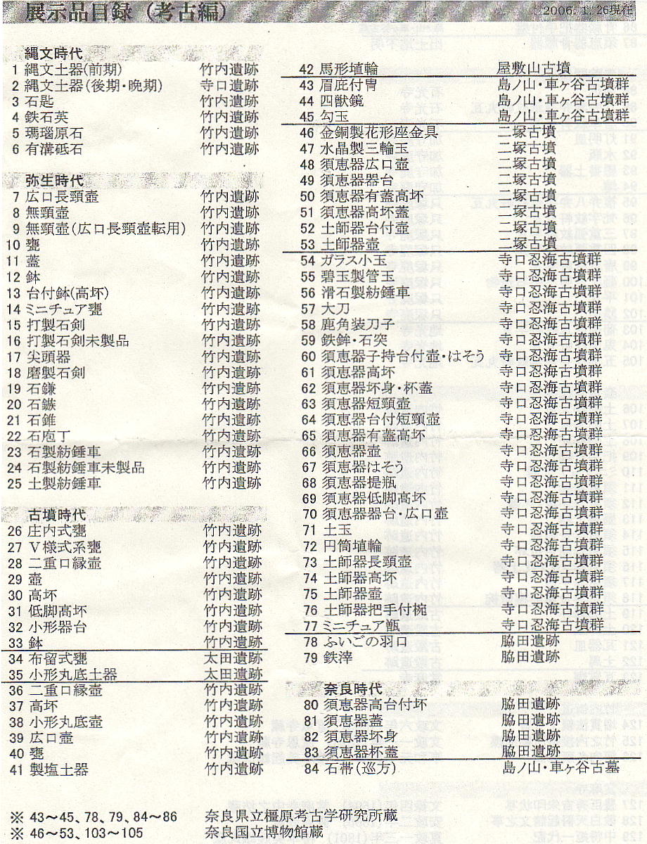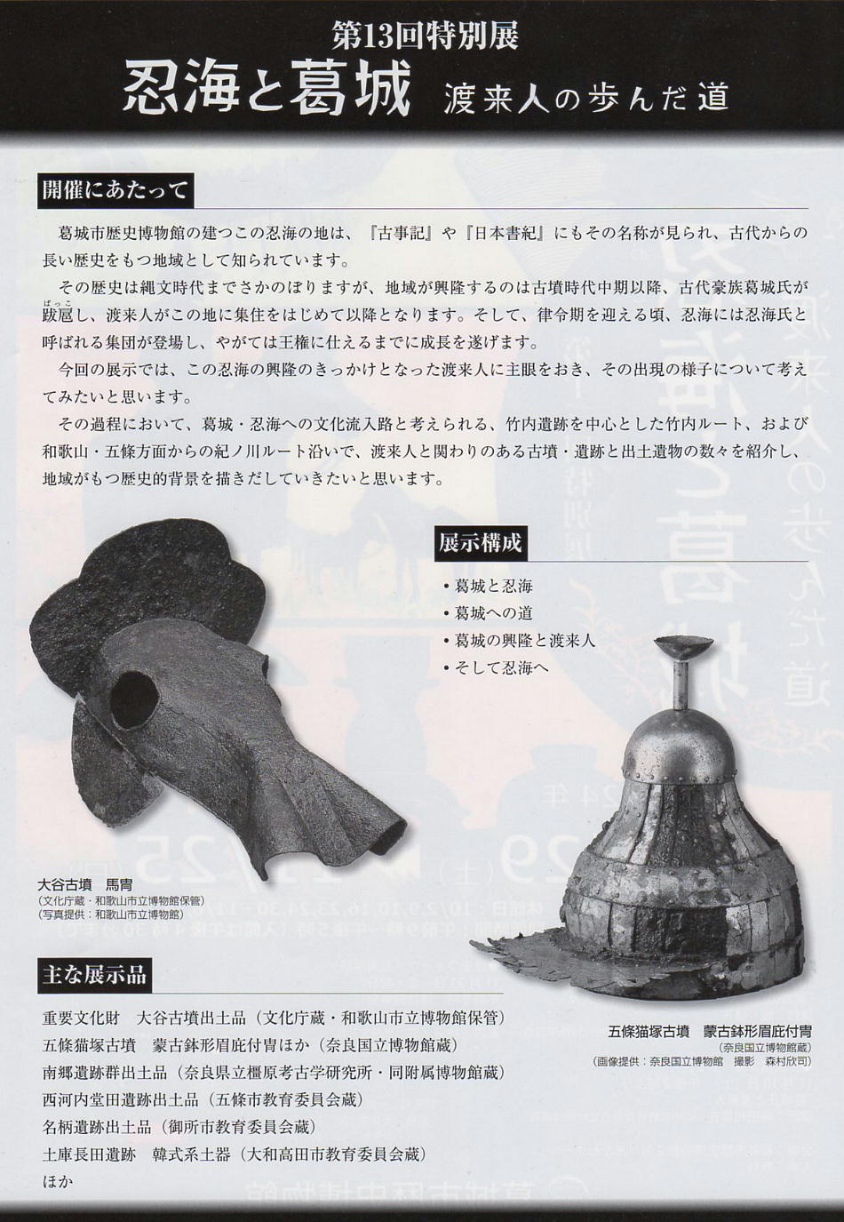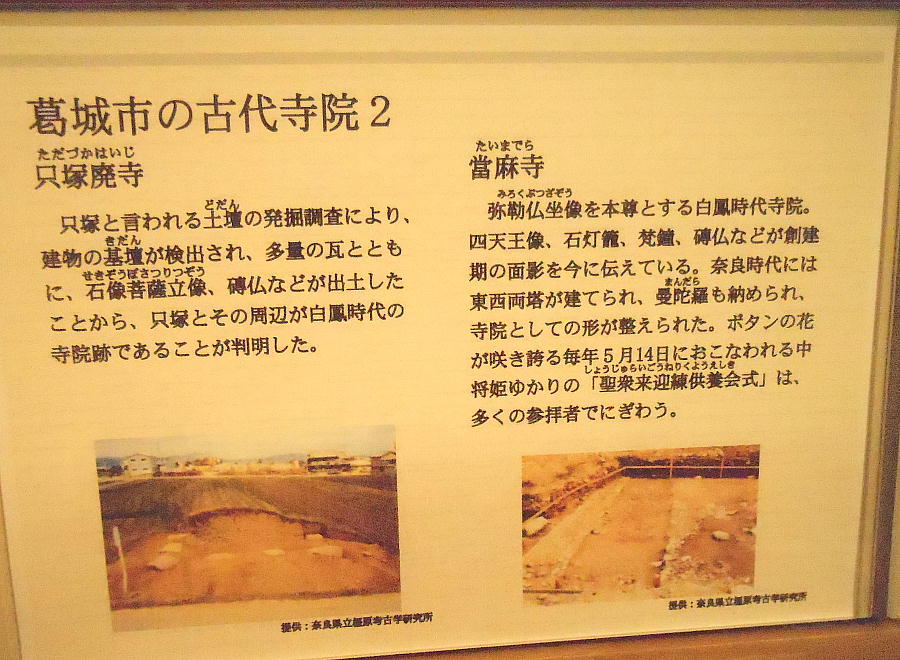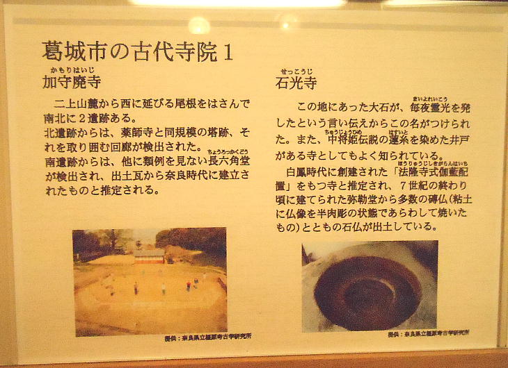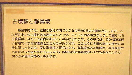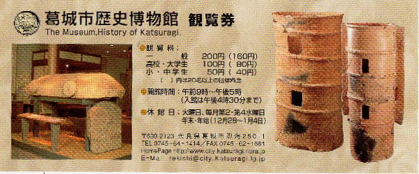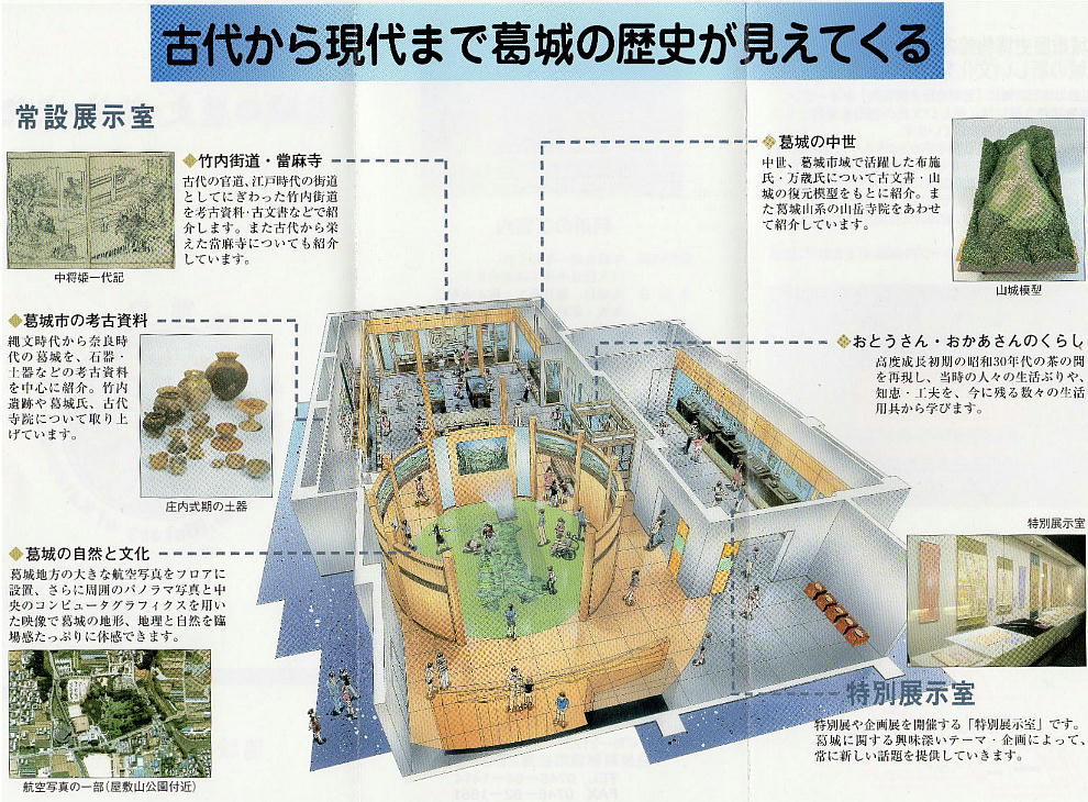 発掘資料・民俗資料も展示され、葛城山麓の歴史を知る事が出来る。(博物館めぐりコーナー「葛城市歴史博物館」参照。)