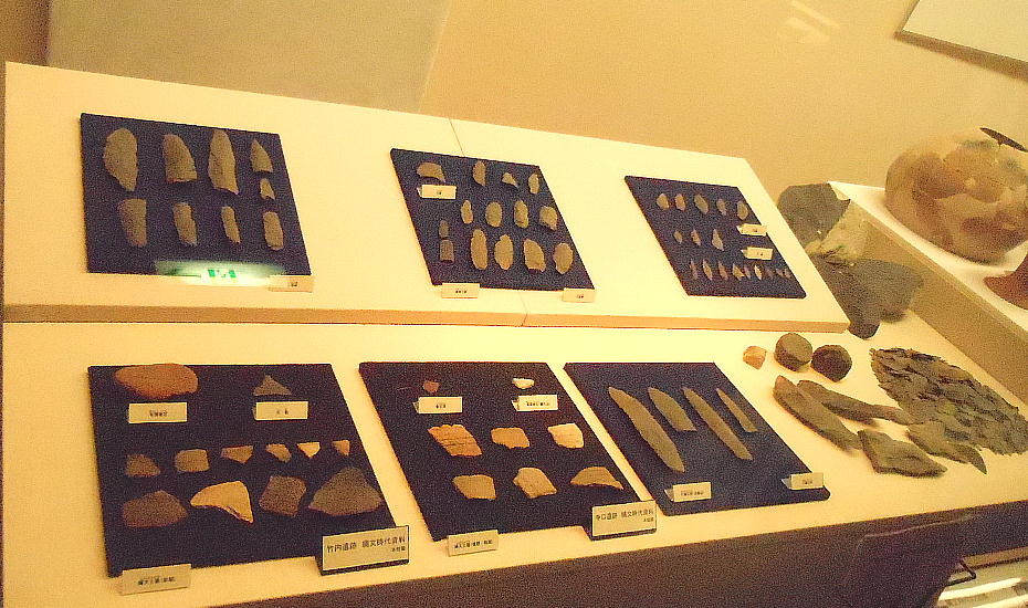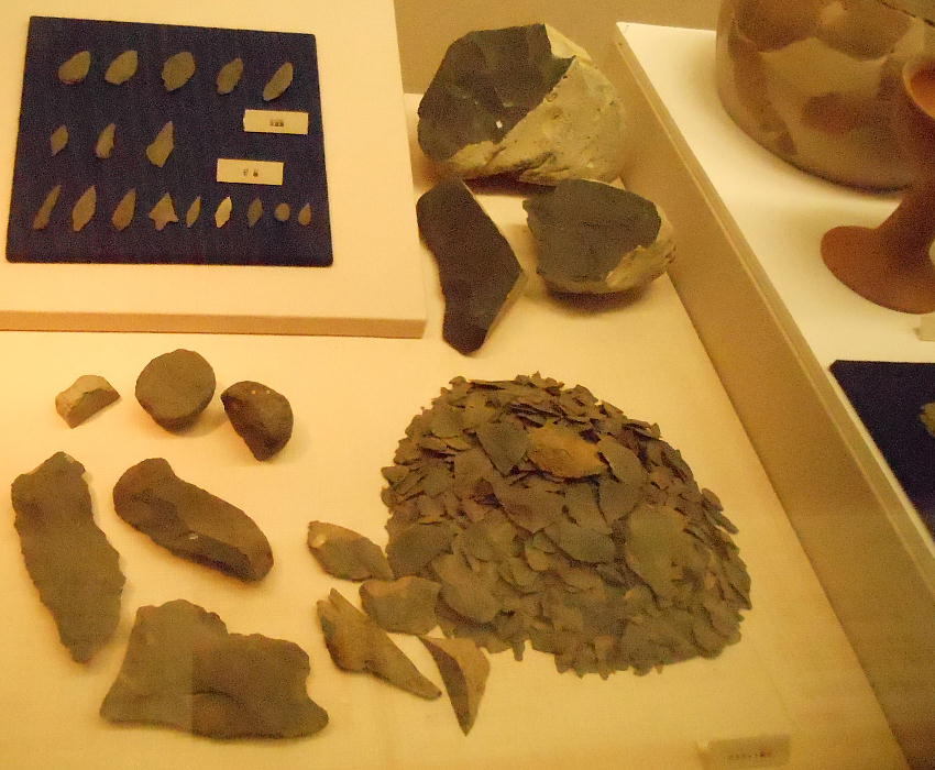 二上山産出のサヌカイトで作られた石器が並ぶ。