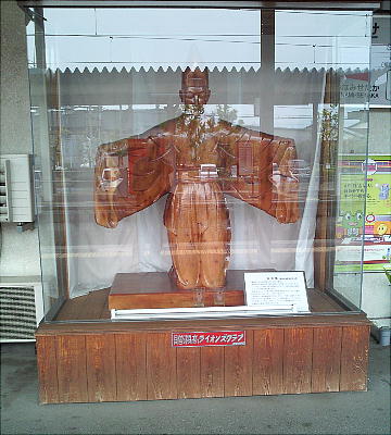 瀬高駅に着いた。駅のホームにあった無形文化財の舞曲像。