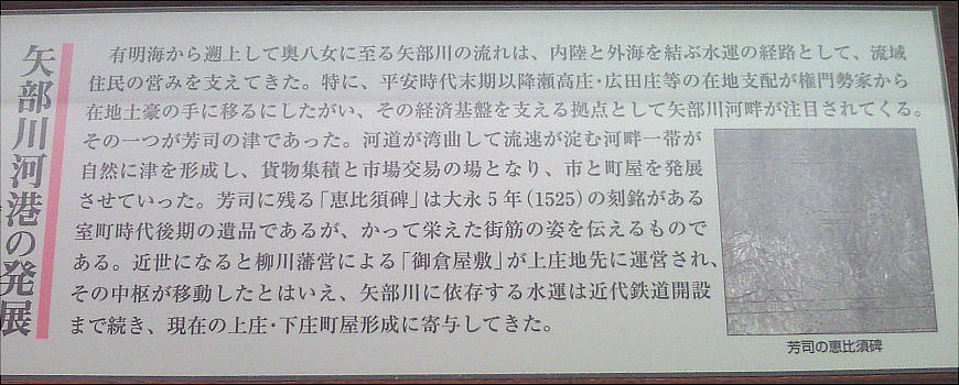 川沿いに貨物の集積と交易の市を芽生えさせます。現在、芳司に残る「恵比須の碑」はその名残りです。町家が発達し、数々の商人・