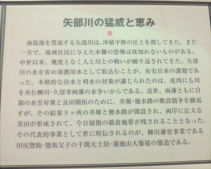 矢部川の治水は、近世農村にとって死命を制する重要課題であった。このため田尻氏を始めとして多くの人々が堤防・井堰を築き河