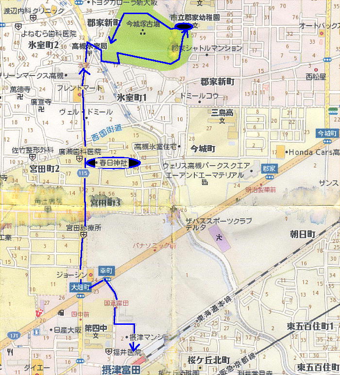 早速受講することにした。一人でJR摂津富田からテクテクと歩いて行ったら、途中春日神社(宮田遺跡)に寄って20分