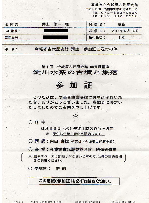 5月例会時に、今城塚古代歴史館に以下のような掲示があったので、申し込んでおいたら「参加証」がFAXされてきた。