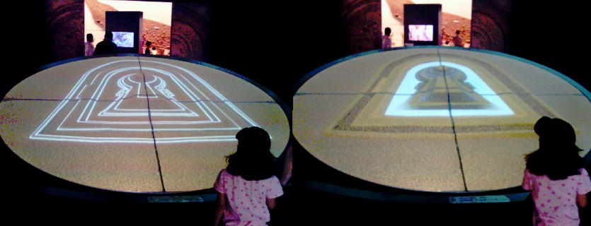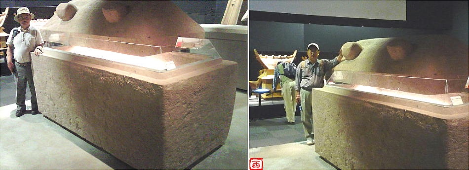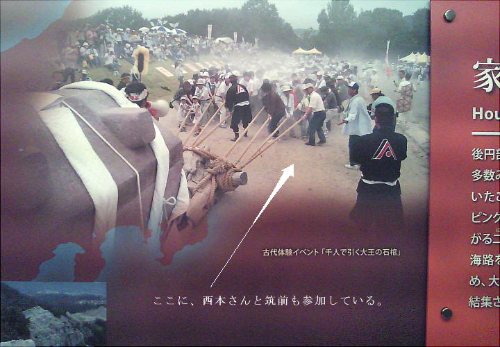 西本さんと私の前の石棺が、「千人で引く大王の棺」実験で引いた石棺の実物である。