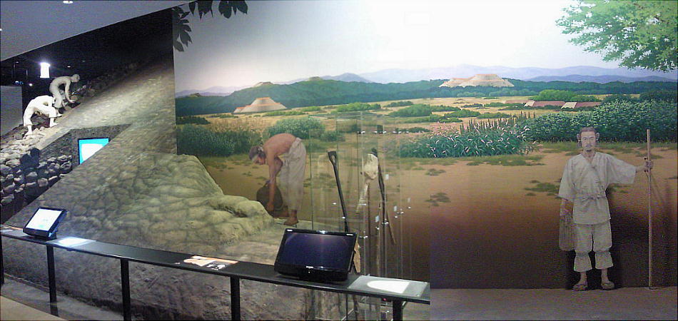 歴史館の展示は石器や土器を除けばレプリカが多いけれども、古墳築造作業のジオラマなど結構迫力のあるものを作っている。