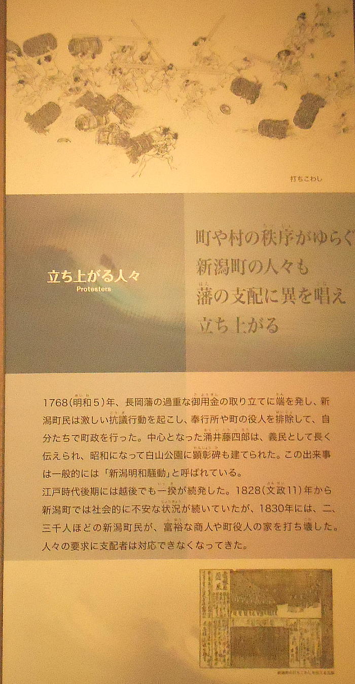 新潟町では、明和5(1768)年、長岡藩が課した御用金が原因で一揆が起こり、町民の支持を得た一揆側が、約2か月間にわたって町