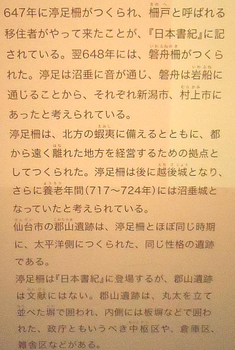 方官)が任命されます。さらに、大化3(647)年には、畿内政権による北方支配の拠点、渟足柵(ぬたりのき)が造られます。渟足