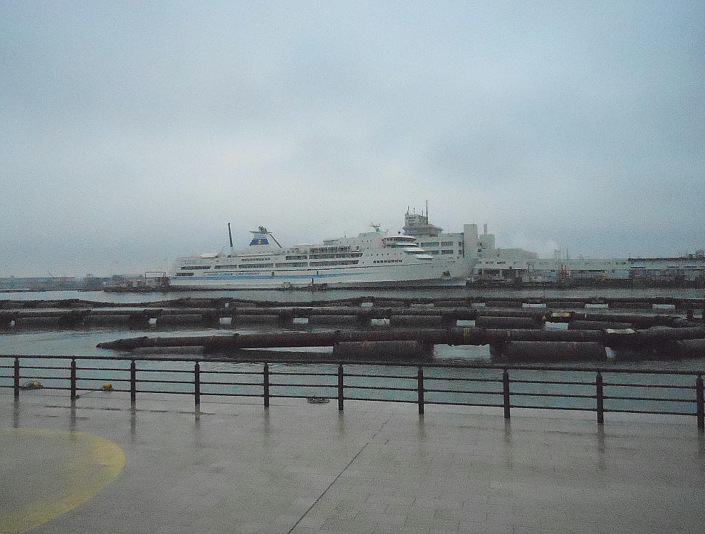 雨のマドロスさん(古いね!)を気取って一服していると、佐渡から来たフェリーが波止場に着いた。デカい。