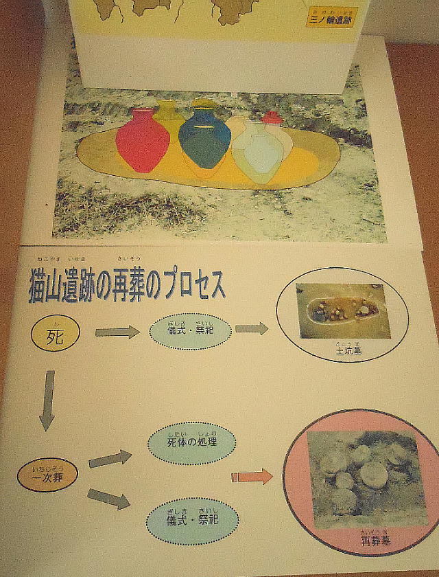 式、加工人骨もほぼ同じ範囲にみられる共通した特徴があり、祖先崇拝と関連した埋葬形態であったと考えられる。再葬墓は土