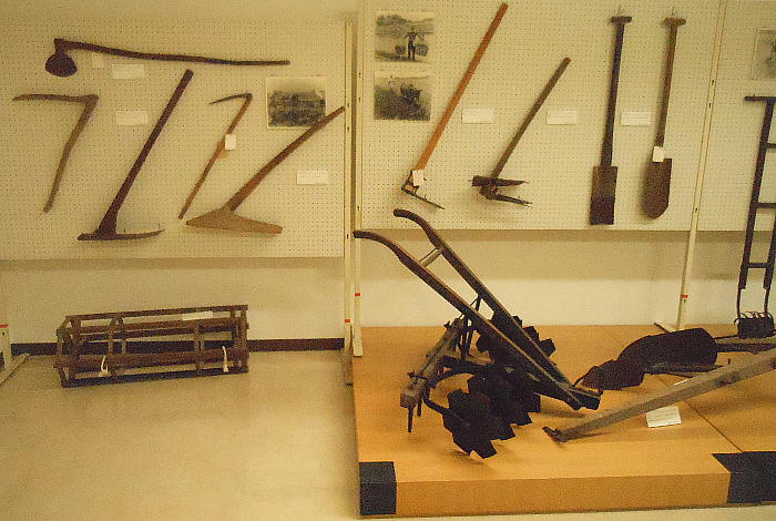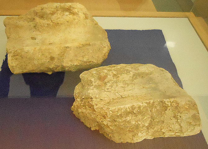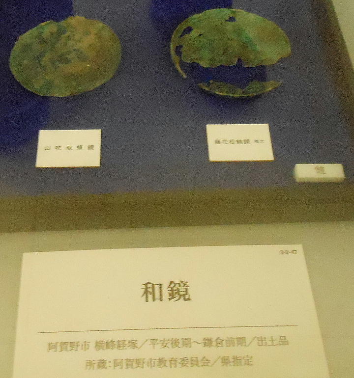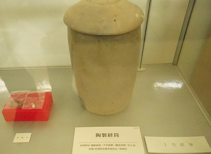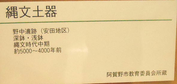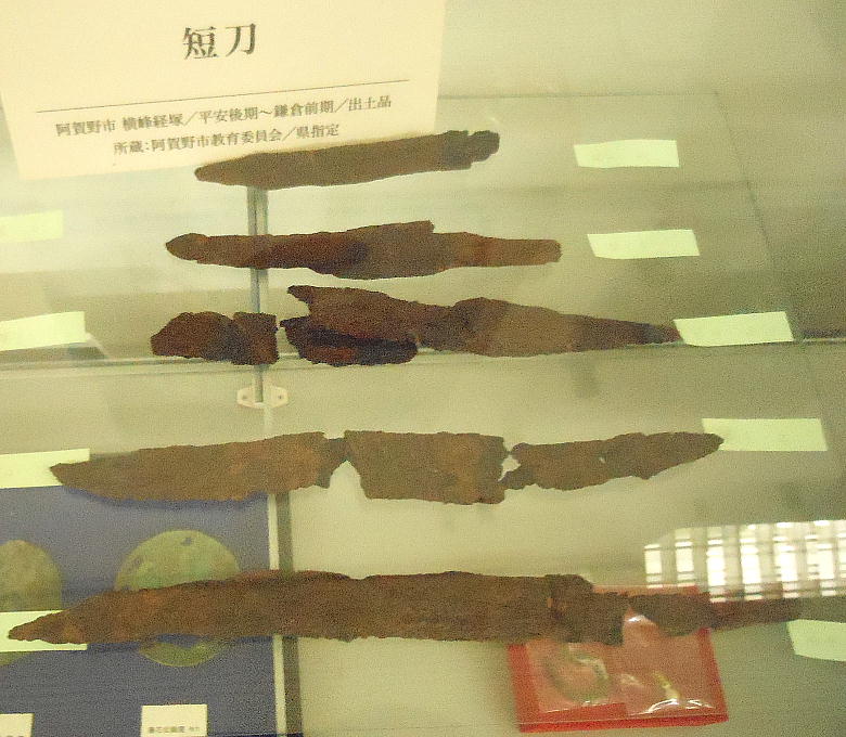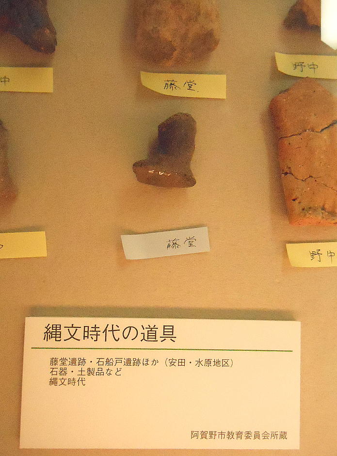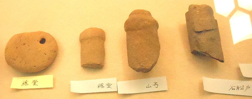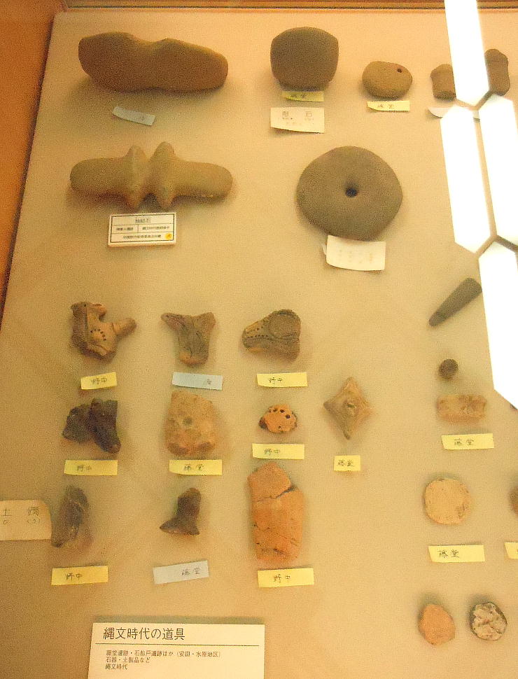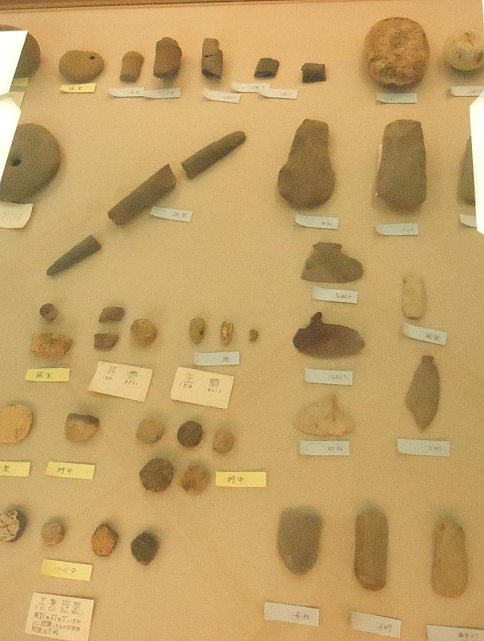 上の写真、上から二段目左端の石器は、独鈷(どっこ)石と呼ばれるもので、縄文時代晩期の「横峯A遺跡」から出土。長さ20cm位。