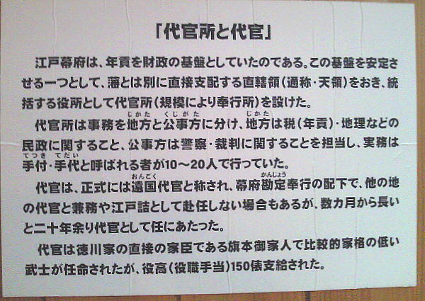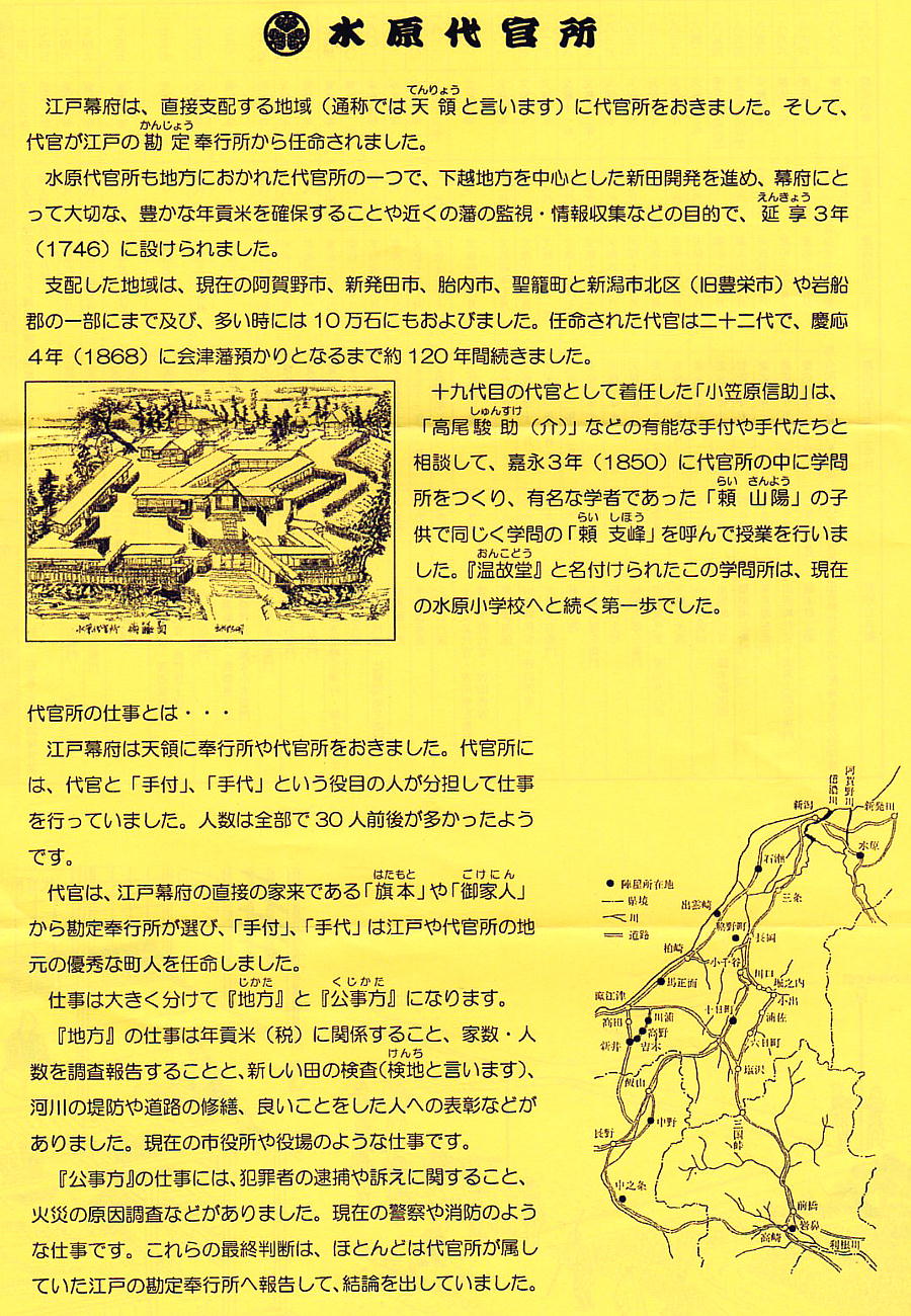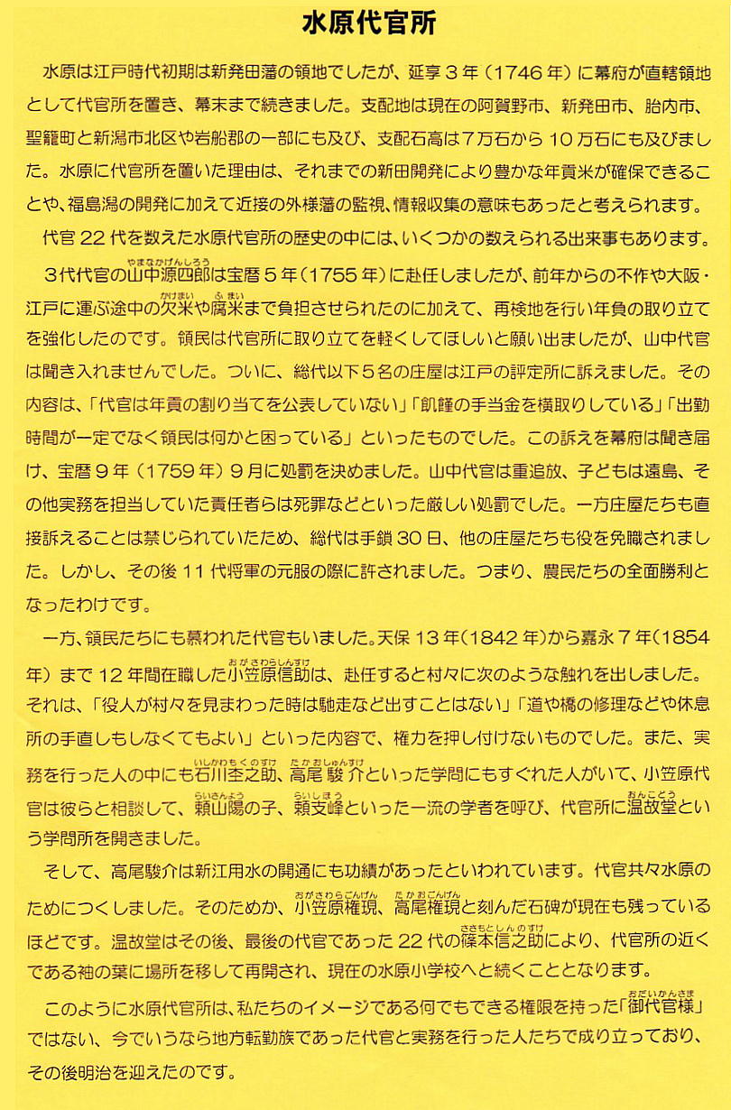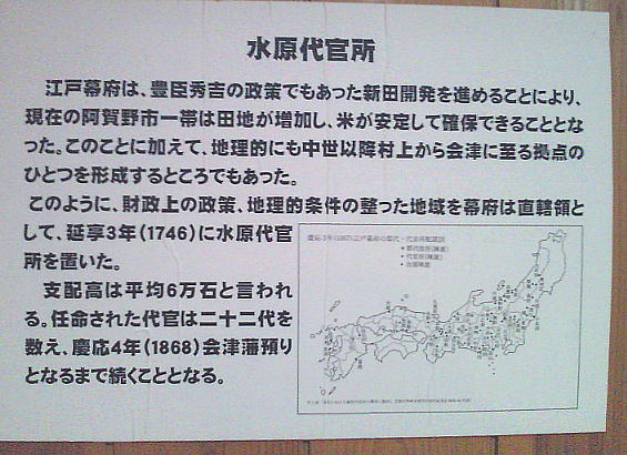 延享3年(1746)に、幕府直轄領として、中世水原氏の居城であった水原城館跡に代官所が設置され、初代代官