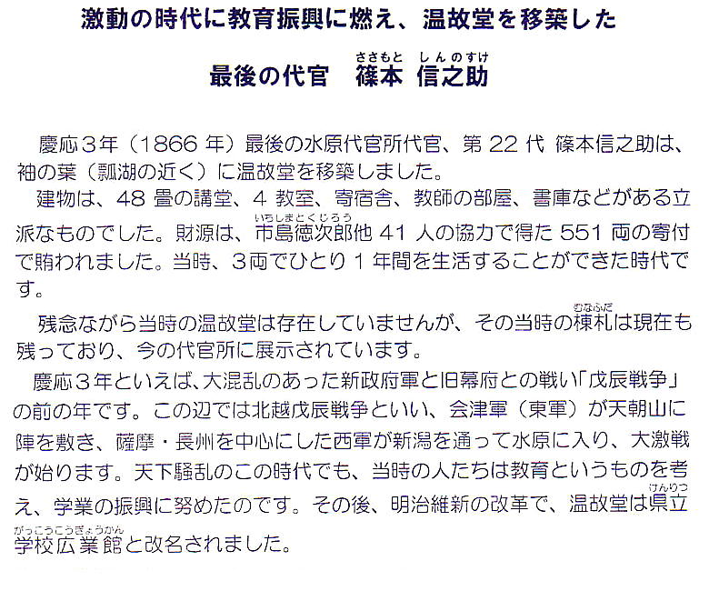 水原代官所は以降22代まで続いたが、1868年(慶応4年)3月戊辰戦争に伴い会津藩預かりとなり、その後西