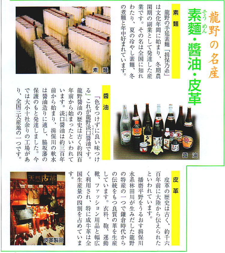 たつの市はソーメンの「揖保乃糸」と「うすくち醤油」で有名です。又脇坂家の龍野藩があった城下町ですが、今はヒガシ