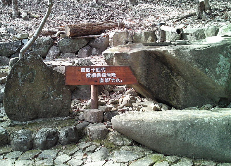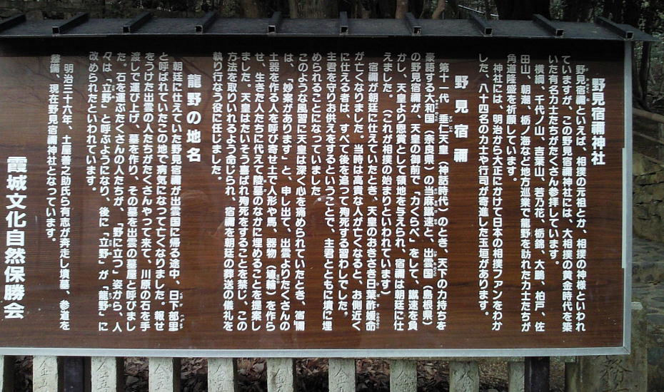 上は野見宿彌神社の参道です。下は横綱栃錦の揮毫による「力水」の石碑。
