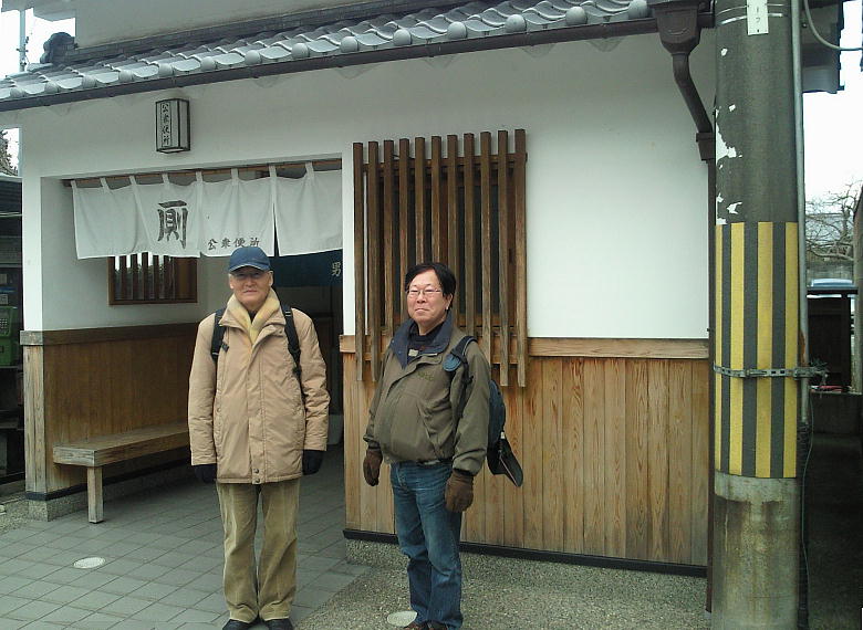この町では公衆便所も昔風に造ってあります。おじさん二人は昔風ではありません、モロ昔です。