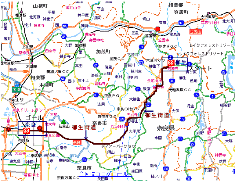 上が今回の地図。近鉄が作ったハイキング・マップだが、すこぶる上出来。下はここから奈良までの地図。クリックすれば大きくなります。