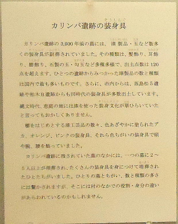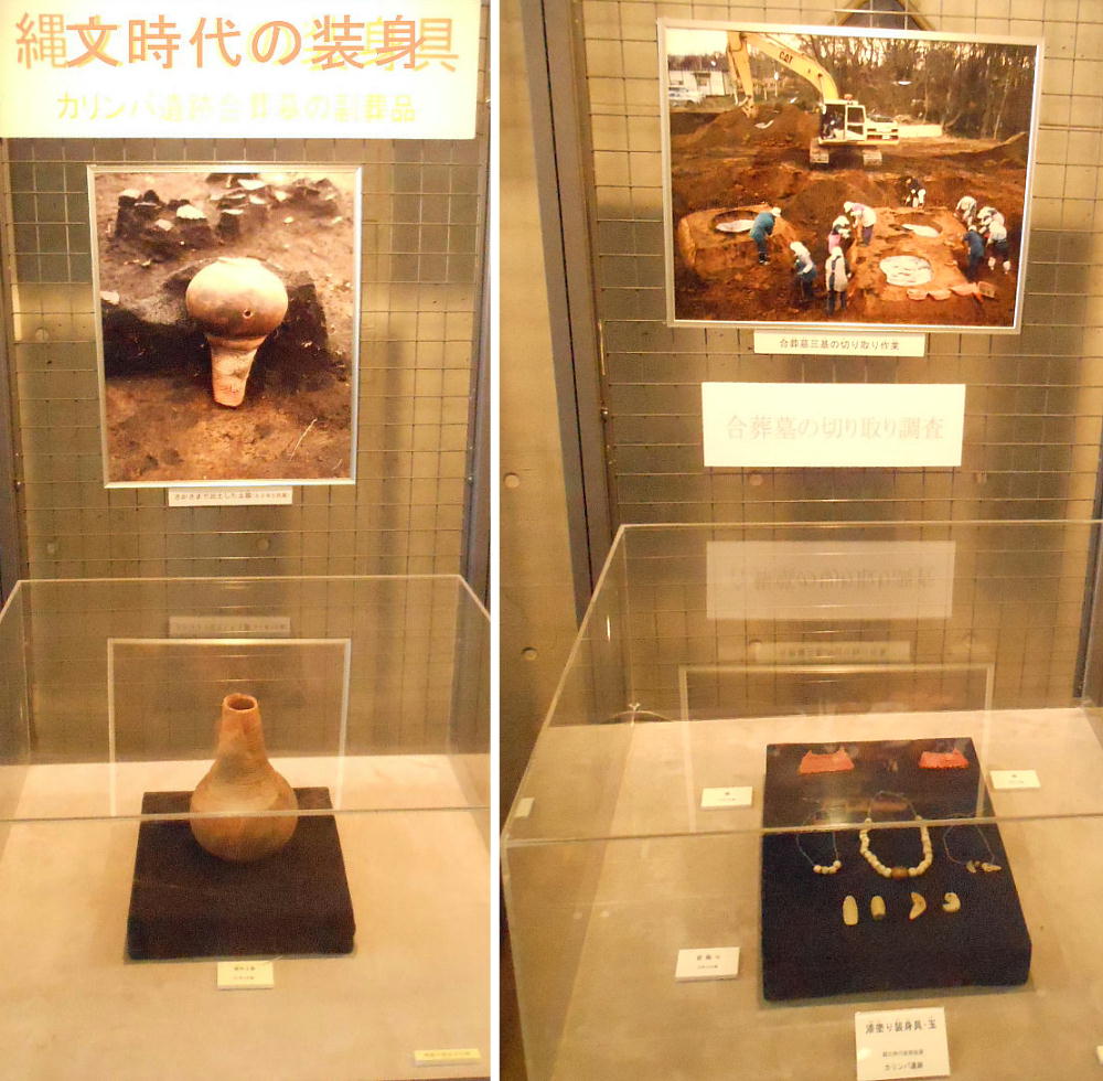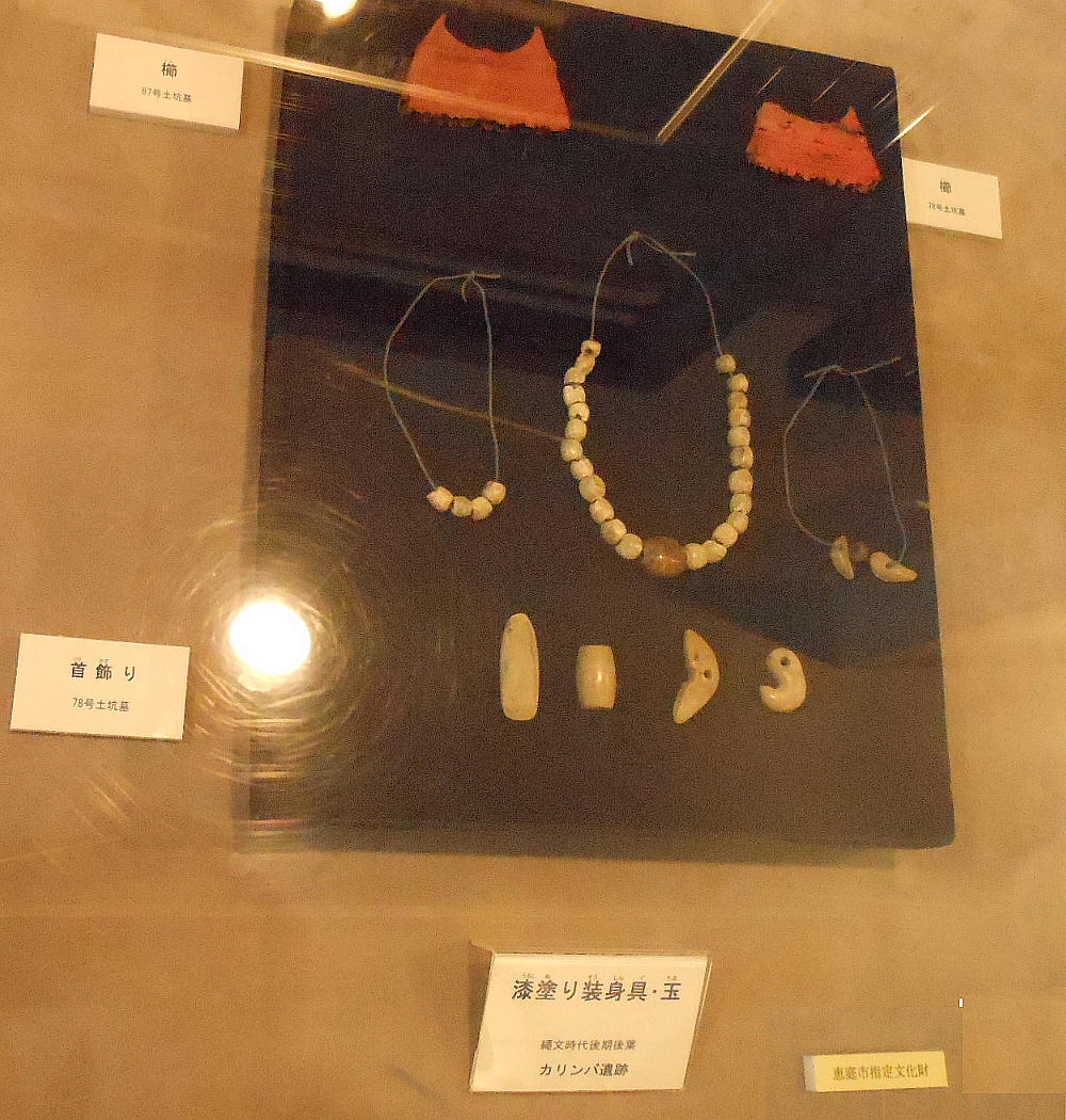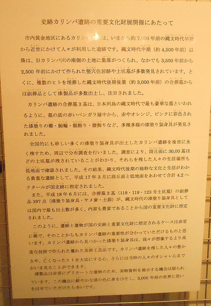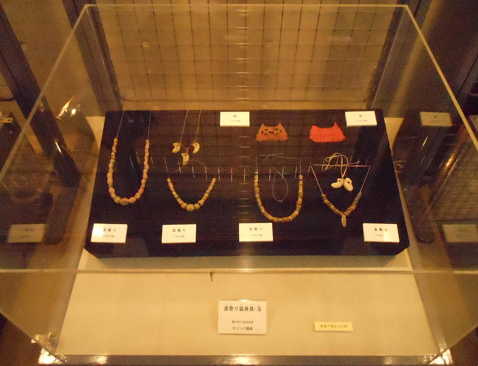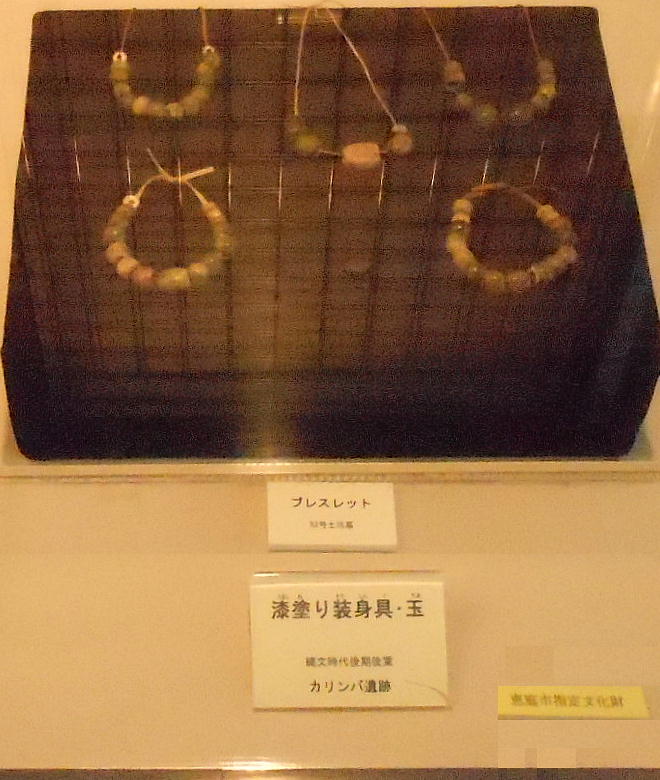 恵庭市南島松の市郷土資料館は6日、国指定の史跡カリンバ遺跡から見つかった漆塗りの装身具、玉、縄文土器など重要文化財397