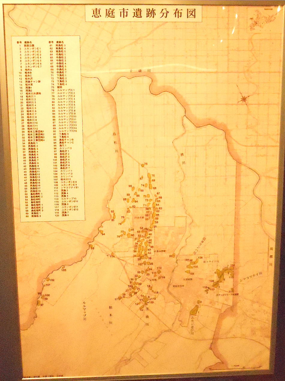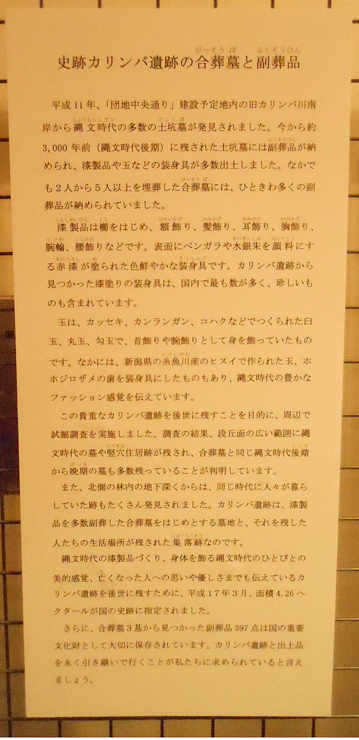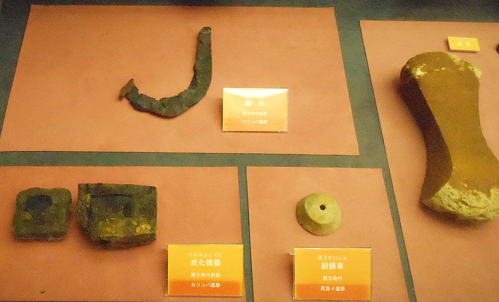 カリンバ遺跡は、JR恵庭駅の北方約800mに位置します。1999(平成11)年の道路工事の際の発掘調査で、縄文時代後期(約3000年前)