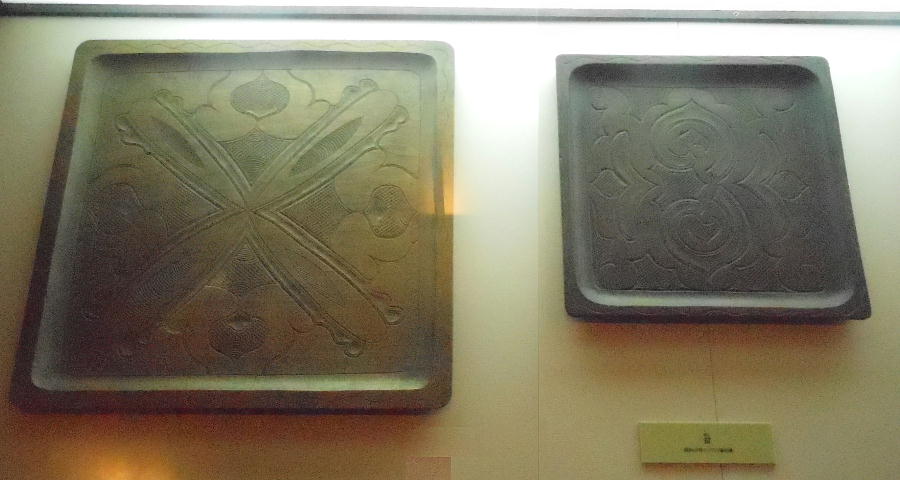 展示パネルには、ピンク色の尖底方土器と水色で示された底平方土器の分布がわかりやすく表示されている。