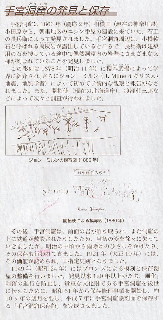 る模刻と保存覆屋の整備が行われた。発見以来120年以上経ち、風化、剥落の進行を防止し、貴重な文化財である手宮洞窟を後世に伝