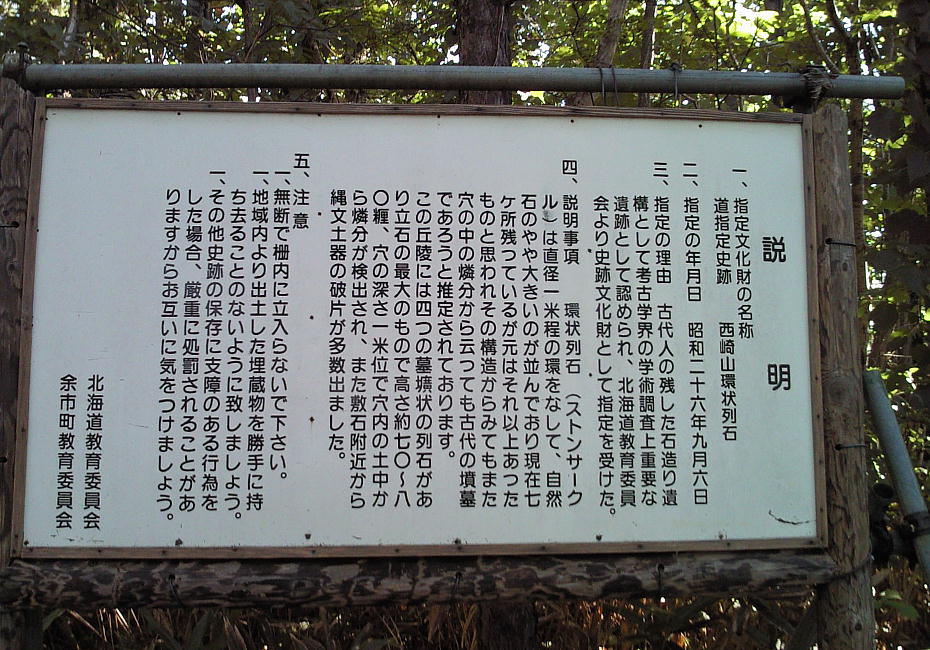 余市町と小樽市の境界となる西崎山の尾根には環状列石(ストーンサークル)と呼ばれる人頭大や幼児の頭ほどの石を円形に並べ、中
