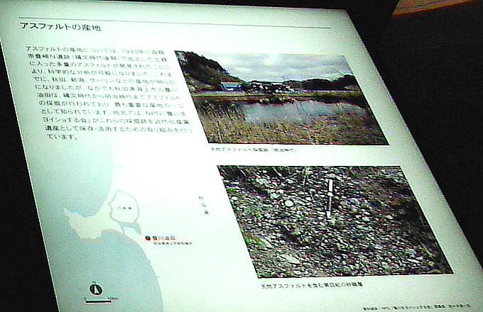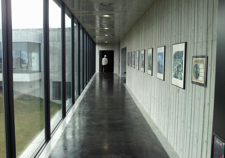中空土偶のコーナーから階段を上がると、渡り廊下になっていて、右壁には付近の遺跡紹介パネル、左側には著保内野遺跡が見えている。