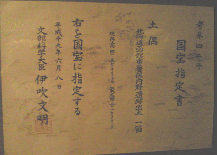 6月8日、北海道初の国宝に指定。展示品の横に伊吹文明元文部科学大臣名の「考第42号 国宝指定書」も展示されている。