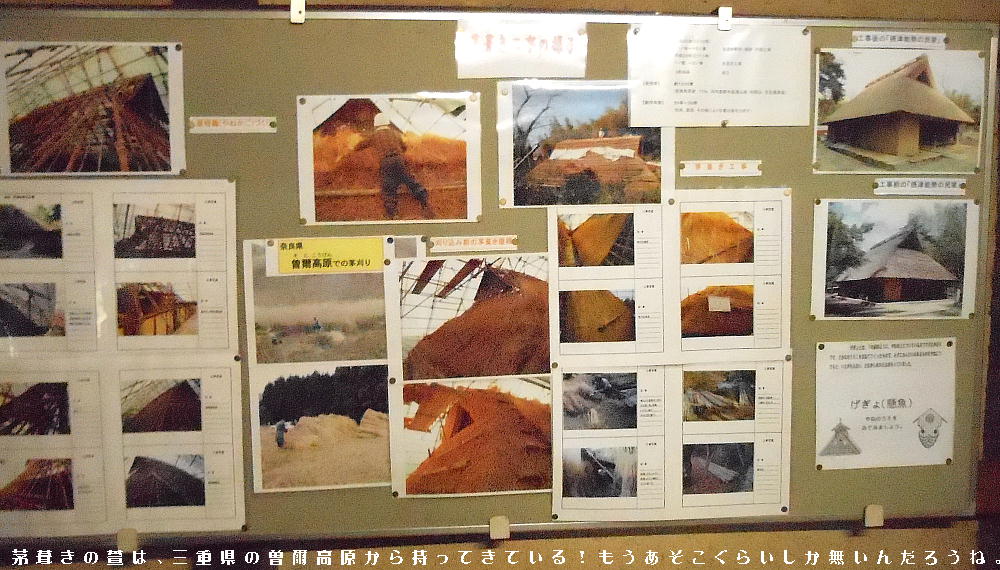 屋根は下地に筵(むしろ)をかぶせ、この上から茅(かや)で葺(ふ)いている。寄棟(よせむね)の屋根にはウシと呼ぶ自然木の