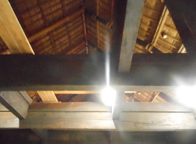 置千木をのせて、棟押えとしている。大家族でもないのにこのような大きな家が建てられたのは、12月の夜、神楽を催すためで数