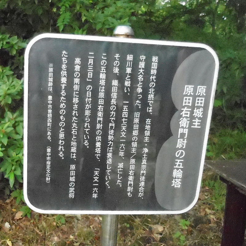 原田城跡(北城)は、昭和38年(1963年)、当時の豊中市文化財保護規則により市史跡に指定され、昭和62年(1987年)の豊中市