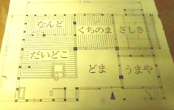 きが狭く、ドジ(土間)・ウチネ(茶の間)デイ(下座敷)・コザ(上座敷)の各部屋が一列に並んでいる、山村特有の間取りをし