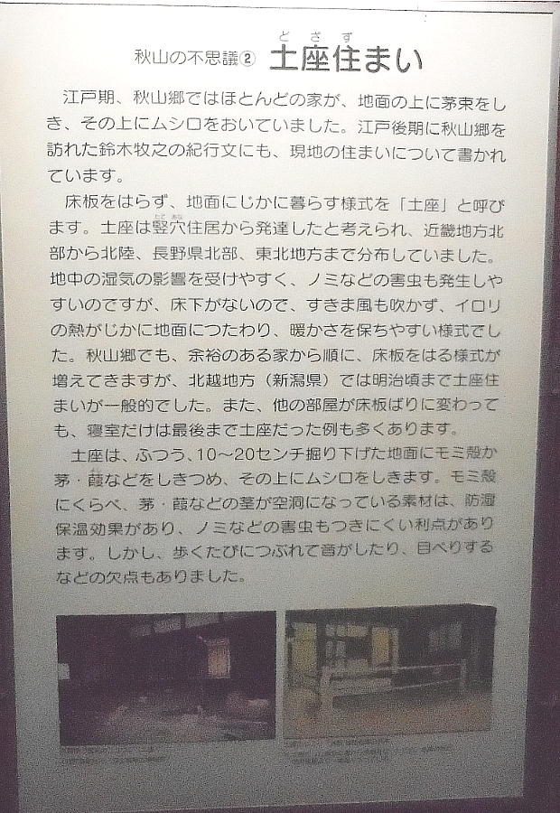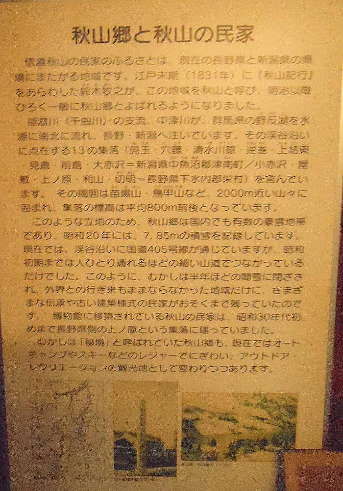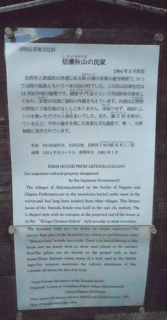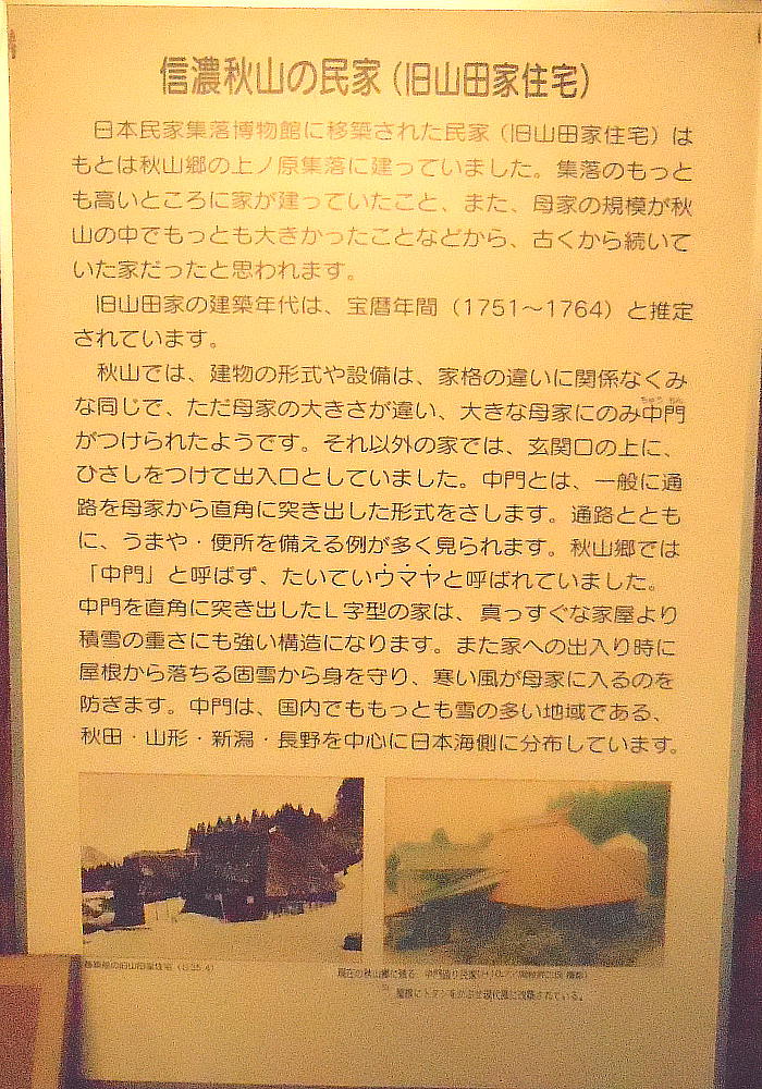 ・旧山田家住宅(信濃秋山の民家) - 長野県下水内郡栄村から移築。茅壁、土座(土間に直接茅などを敷き詰め、ムシロを敷いたもの)、