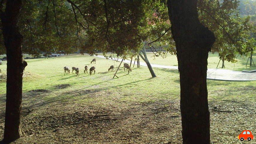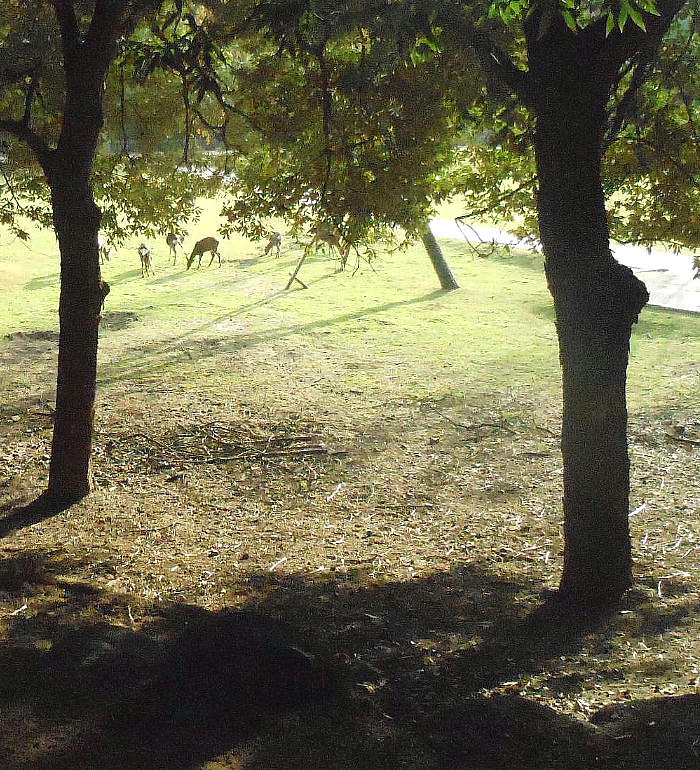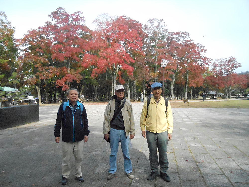奈良公園内はだいぶ紅葉が進んでいる。木によって違うのだろうが、全く緑のママの木々もあった。