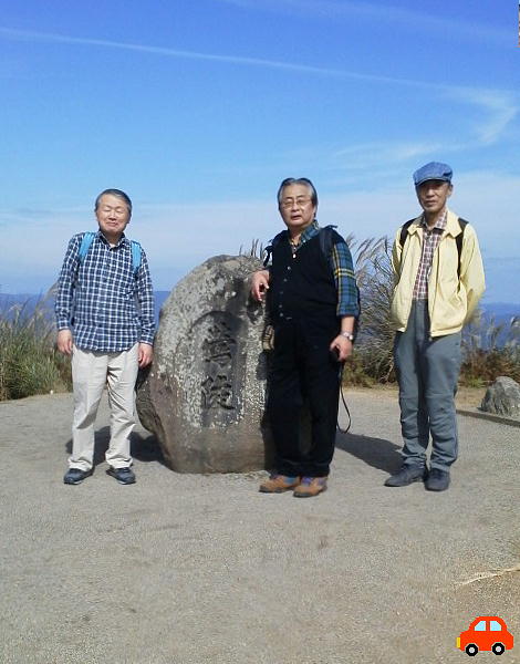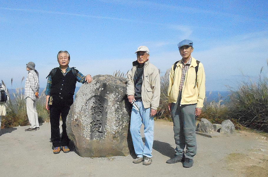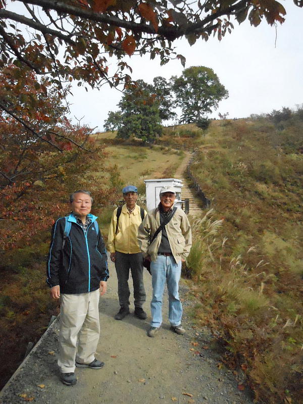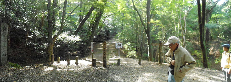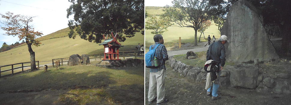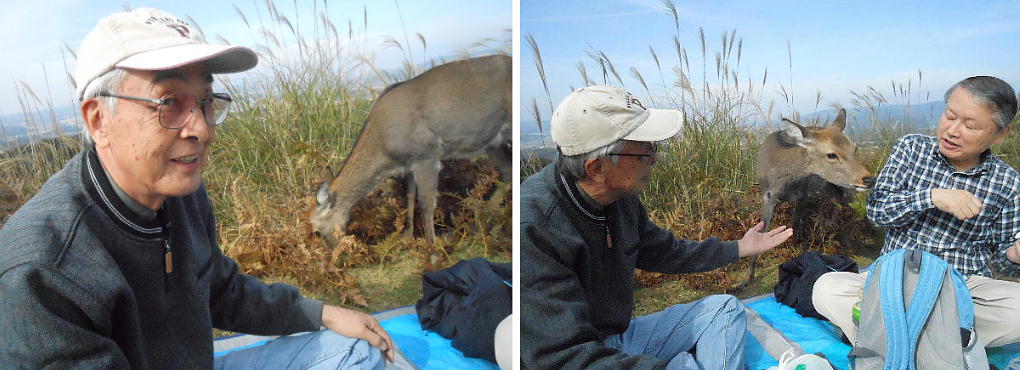 後円部の隅で昼食にしたが、シカがおかまいなしに寄ってくる。イヌ猫の嫌いな大隈君はシカにも怯えきっている。