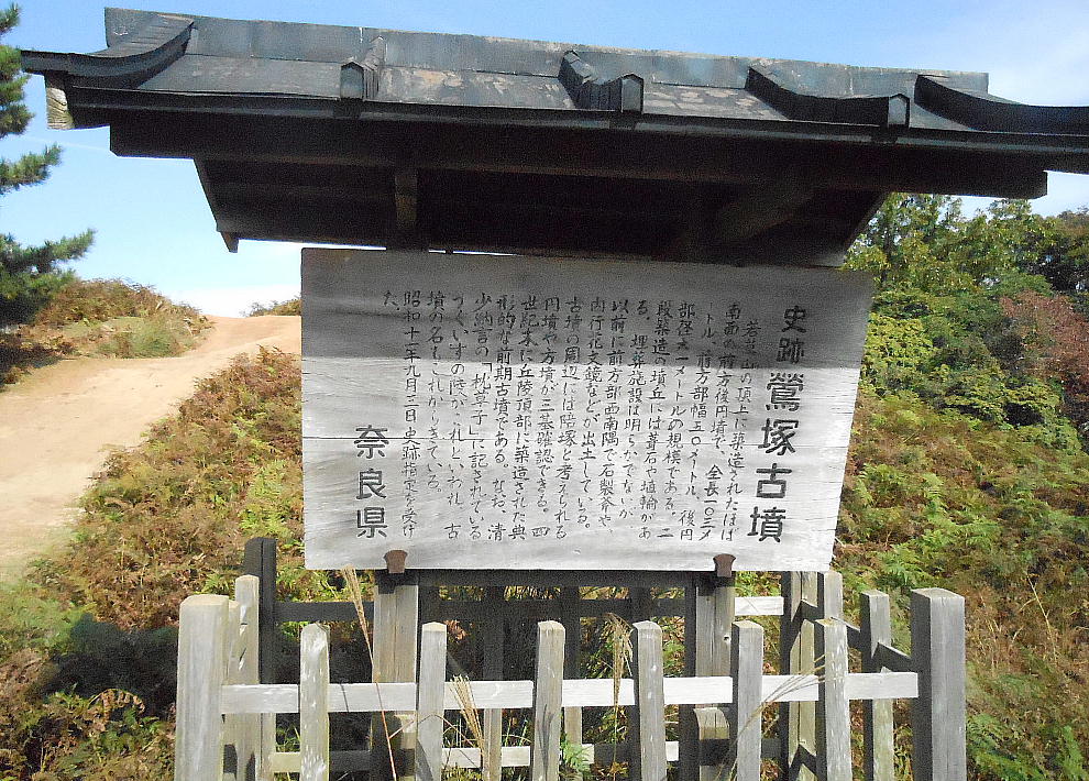 前方部と後円部のくびれに、奈良県の「鶯塚古墳」説明板がある。