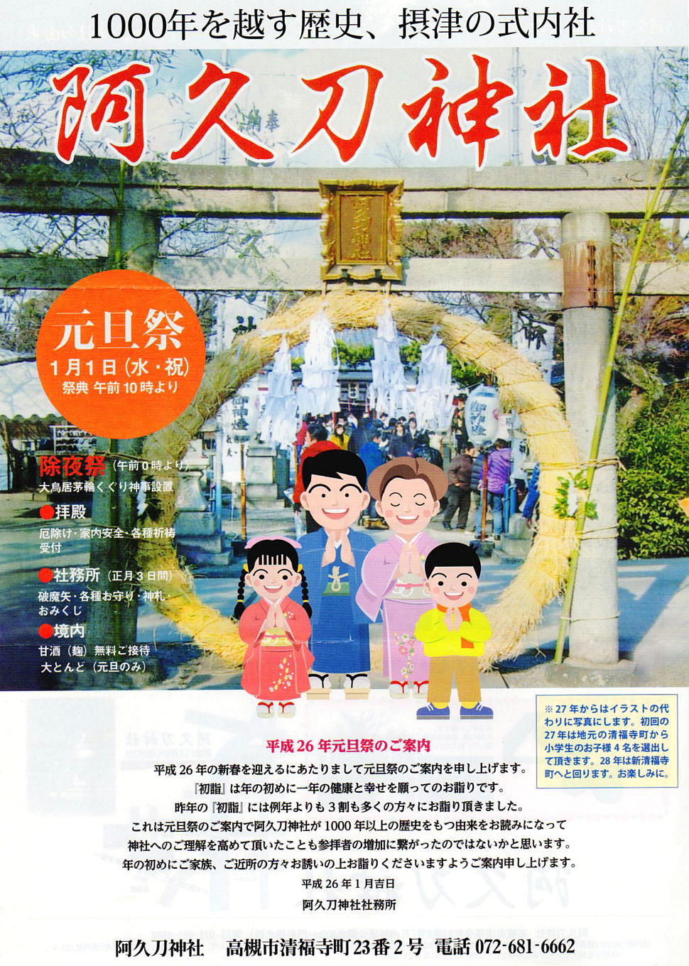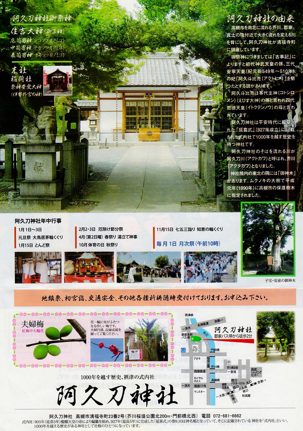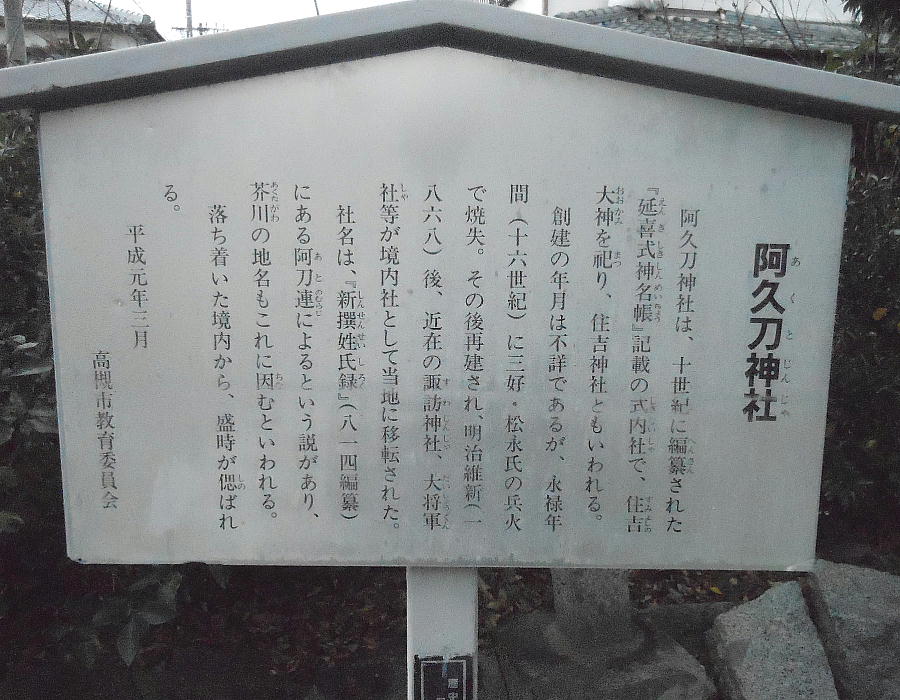 前出の高槻市の郡衙跡説明には「式内社・阿久刀(あくと)神社周辺には嶋上郡の郡司(長官)一族の住まいがありました。」とあった。