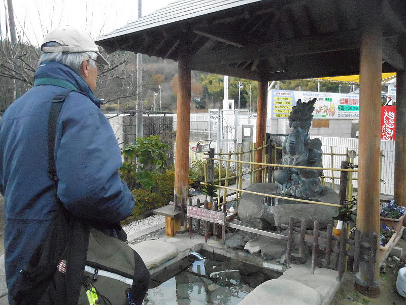 これは建物の前にある「足湯」である。龍の口から湯がでて下へ流れ込む。