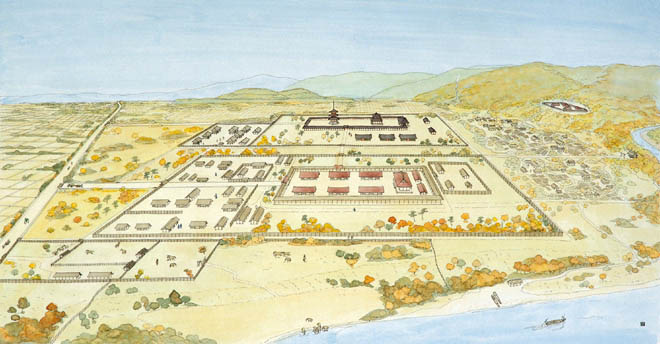 物が建ち並び、築地塀で囲まれている。8世紀の造営で、9世紀前半まで存続した。