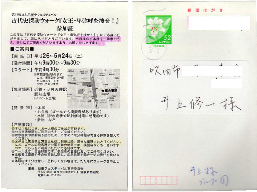 の奈良新聞へ、歴史倶楽部面々の氏名、住所、年齢(これは当てずっぽ)等々を書いて申しこんだらどうやらまだ一般公募する