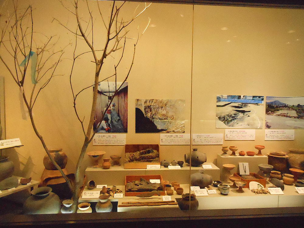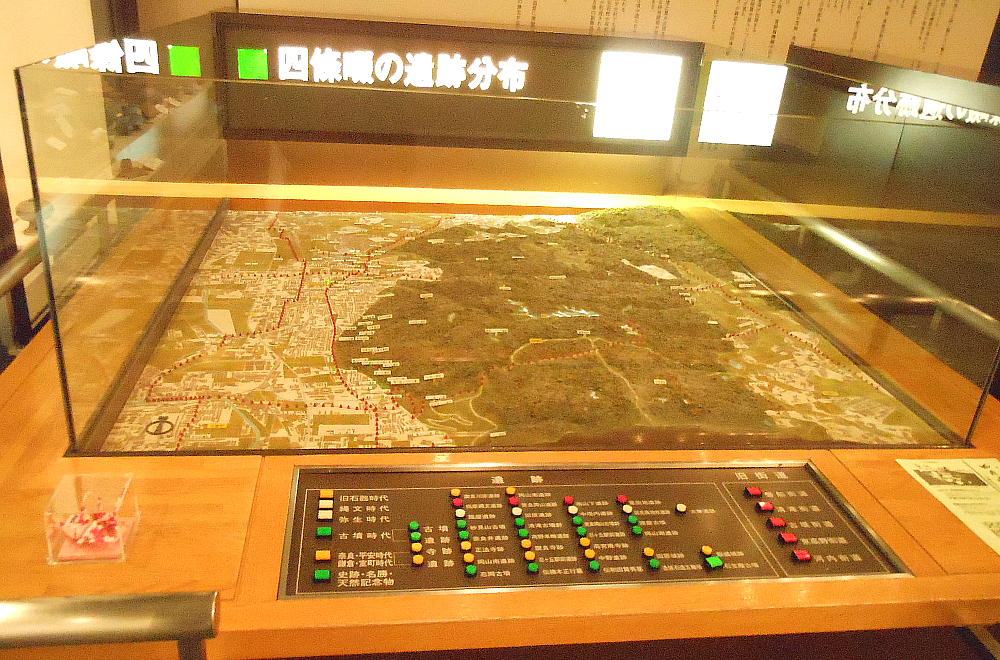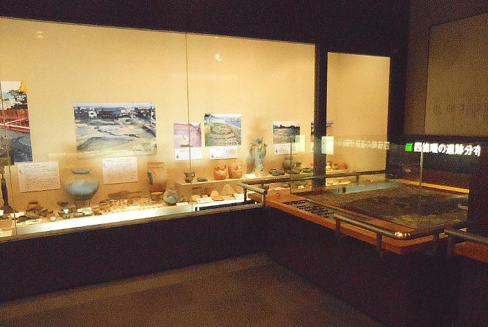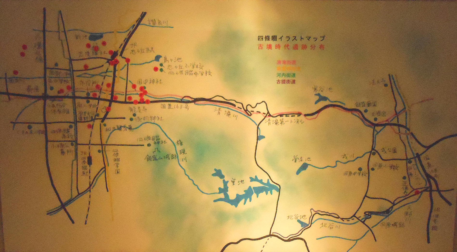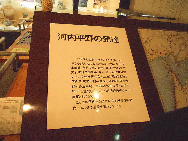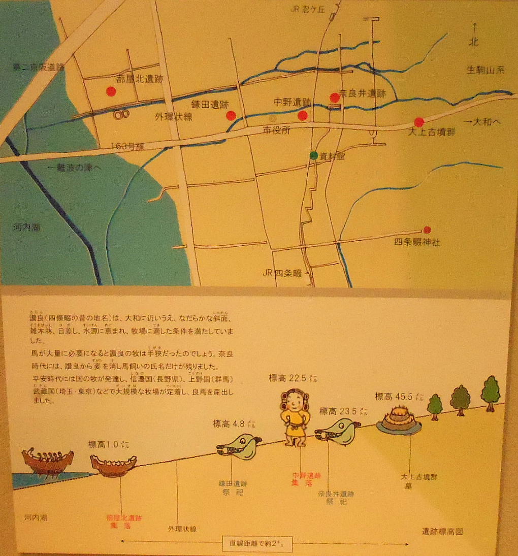 正面に大きな四条畷市内の遺跡分布図が掲げてある。展示室への廊下の端に「雁屋遺跡」から発掘された弥生人の全身骨格が