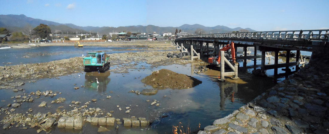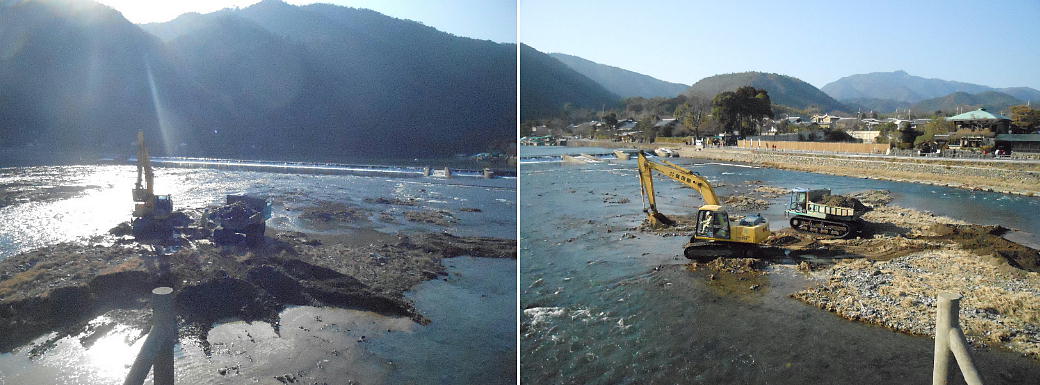 渡月橋を渡っていたら。ブルトーザーがひっくり返した土の中に、獲物を求めて彷徨(うろつ)くサギたちがいた。