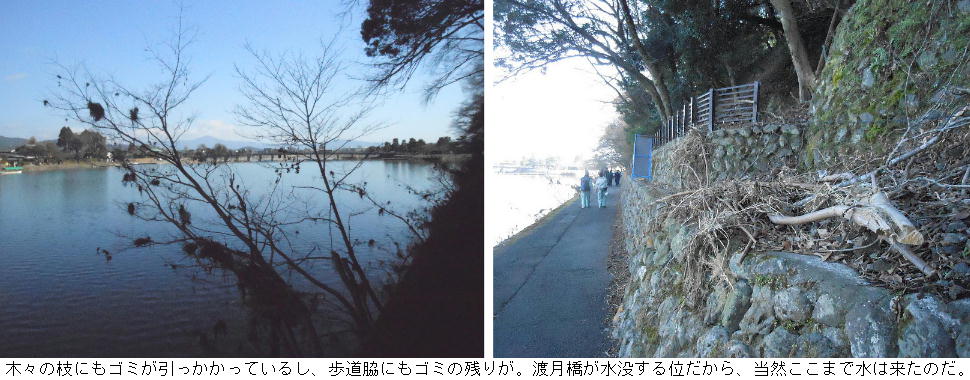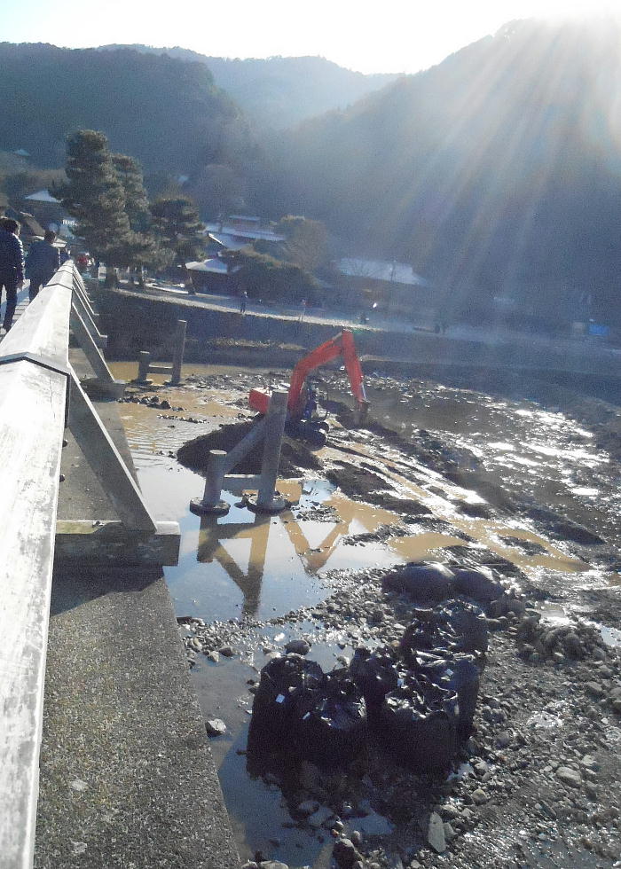 幸いにも渡月橋は流されずにすんでいるが、濁流の痕跡はアチコチに残る。